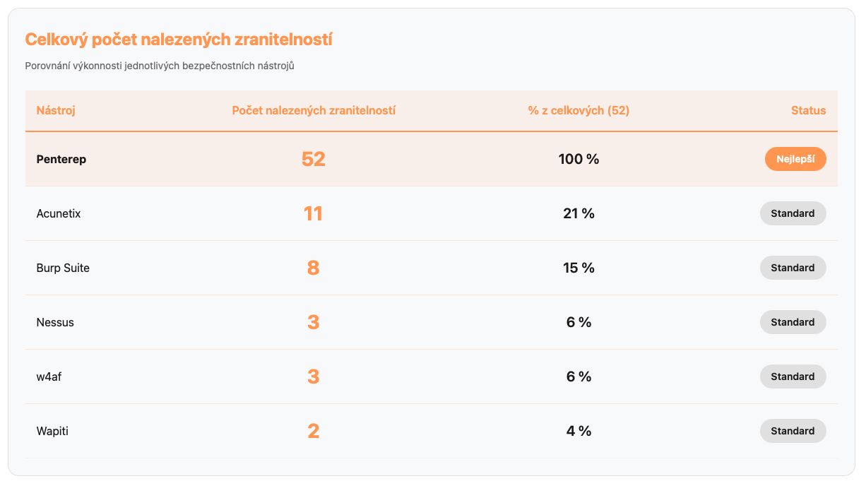 Díky tomuto přístupu Penterep dokázal jako jediný nástroj zachytit 100 % zranitelností – a hlavně i ty, které by v praxi představovaly největší riziko pro organizaci.