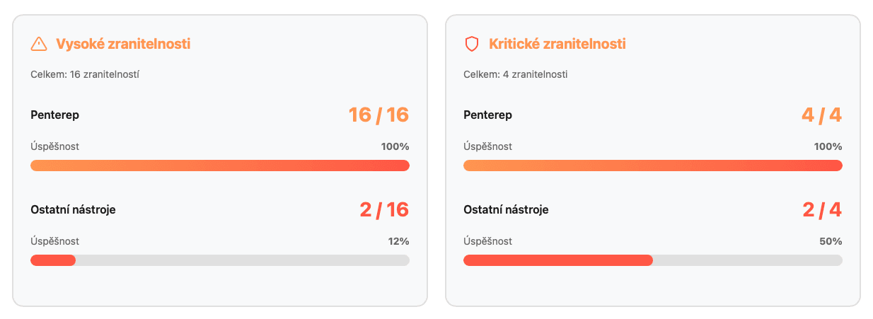 Díky tomuto přístupu Penterep dokázal jako jediný nástroj zachytit 100 % zranitelností – a hlavně i ty, které by v praxi představovaly největší riziko pro organizaci.